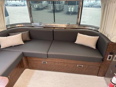 The custom curved overhead cabinets give a seamless feel and the hydraulic hinges not only keep the doors in place when they are opened, but also provide a soft close when you shut them. The ducted air conditioning system quickly cools down the cabin in almost silence with a heat pump to pull ambient heat from the air. You will be able to back up and park easily with the rear-view camera, and the USB and 110V outlets are strategically placed so you don't have to go very far to keep your devices charged!